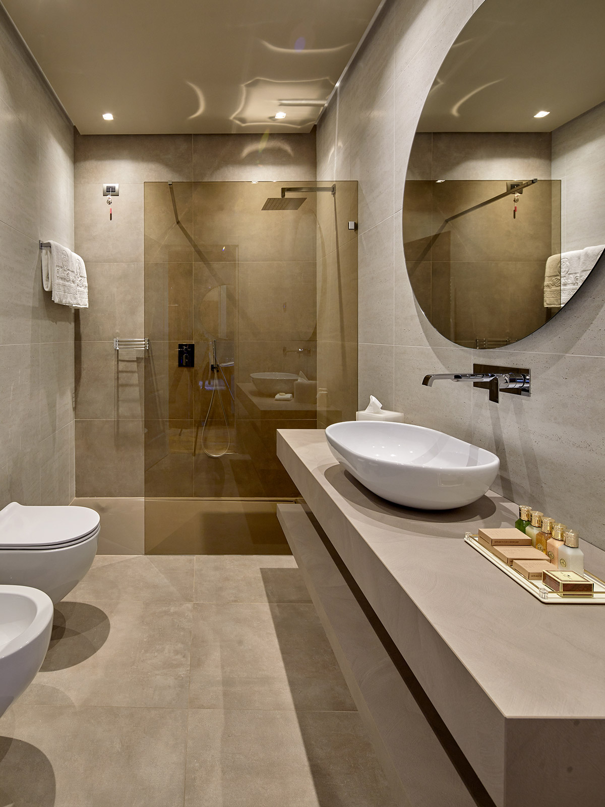 Das Bad aus Marmor besitzt eine große Duschkabine.
