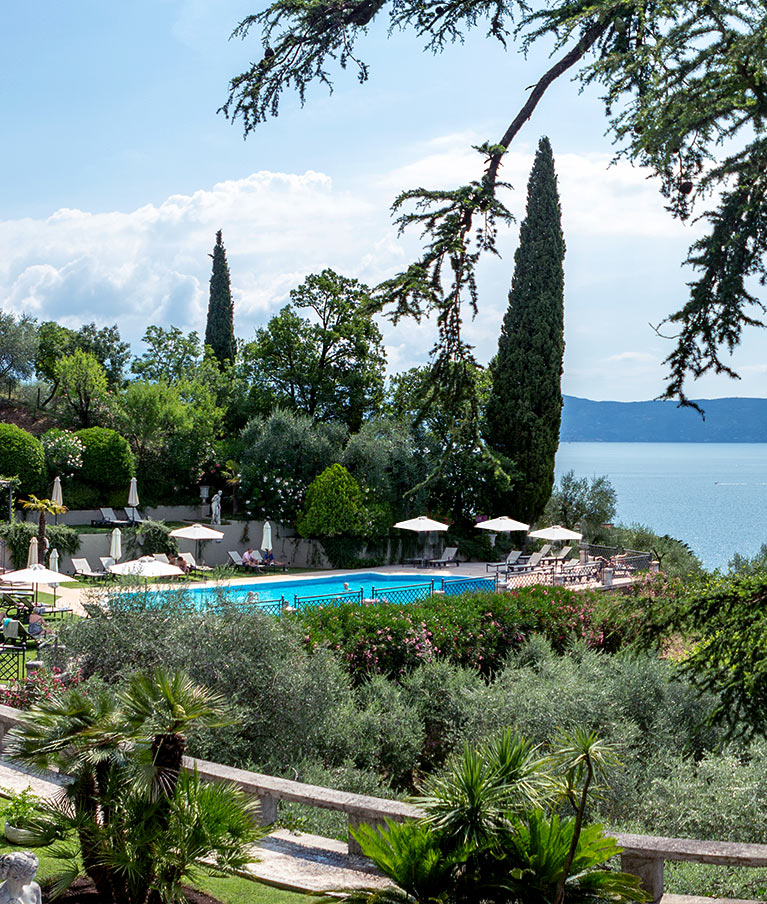 La piscina dell'Hotel è situata nel parco vicino al campo da tennis e ad uno dei due tempietti neoclassici che arricchiscono il fascino del giardino.